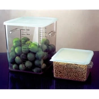- Rubbermaid FG631800CLR 18 Quart square food storage container is a convenient, durable, and efficient solution for food storage. Its clear, break-resistant polycarbonate material allows for greater product visibility, and its smooth surfaces allow for easy cleaning. Made of FDA compliant materials, this food storage container is dishwasher safe and able to withstand temperatures from -40 To 212°F. Square containers store up to 25% more on a shelf than round containers, providing compact storage for your busy kitchen. This square container also features black measurement gradations on both sides.