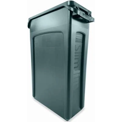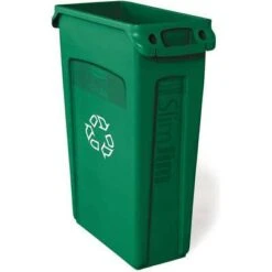 Slim-profile rectangular plastic recycling cans are more narrow than standard rectangular cans and can be placed flush against a wall to limit the amount of floor space used. Use these cans in areas that generate medium-to-high volumes of recyclables, including copy rooms and break rooms.