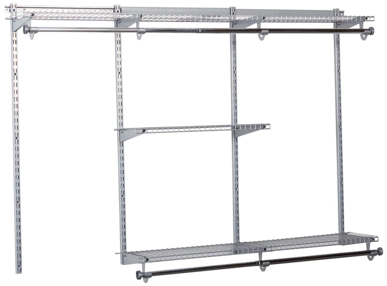 The key to getting the most out of your closet is how you use the space inside it. Rubbermaid Configurations Custom Closet Starter Kit makes the most of the space found in any closet with at least one wall 3-6 ft wide. Properly installed, it provides an extra 12 ft of shelving space and 10 ft of hanging space with expanding shelves and telescoping rods. Easy to install without cutting, it includes two 36.26 in shelves, one 26.25 in shelf, four 47.5 in uprights, two 36 in top rails, 7 brackets, 7 clothes rod hangers, three 22 in rail covers and three hang rods. For even more organization options, additional Configurations accessories are available.