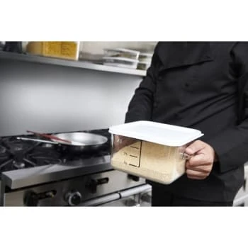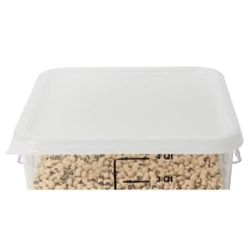 - Rubbermaid 6509 Color-Coded white food storage container lid. Created to fit compatible 4 and 8 qt square containers, this polyethylene lid is designed to create a tight, leak-resistant seal that will make your commercial kitchen a safer environment. Your staff members will be able to consistently identify which food storage container to use when prepping and storing for busy breakfast, lunch, or dinner rushes. Use this lid with your white color-coded container to safely store dairy products. It can handle temperatures between -20 To 212°F, making it a versatile addition to your kitchen.