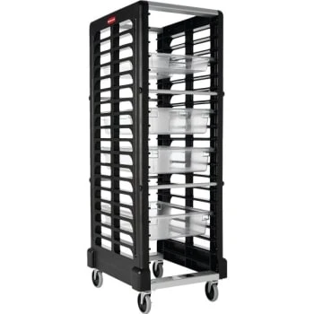 - The Rubbermaid Commercial Max Systemâ„¢ prep cart rack with cutting board is ideal for a wide range of food preparation, transport, serving and storage tasks. Features rack slots plus a cutting board on top. Impact-resistant polypropylene construction with soft rounded corners that won’t dent or scratch walls or doors. Locking bar helps reduce spills and tip overs. Quiet handling design.