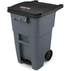 Rollout trash cans have built-in wheels to make it easier to move the can when full. Treaded wheels keep the can from slipping so they can be used indoors and outdoors. An integrated lid swings open to allow access to the contents, and keeps trash and odors contained when closed. Wheeled rollout trash cans are used indoors and outdoors when large amounts of waste need to be collected or transported, such as curbside residential waste collection, warehouses, and waste-processing facilities.