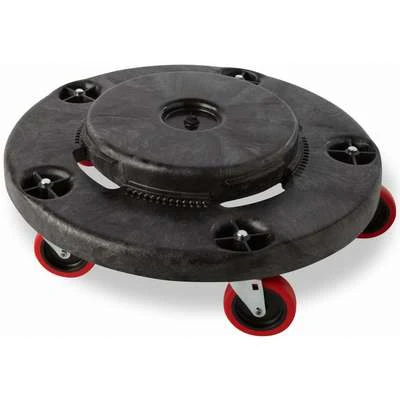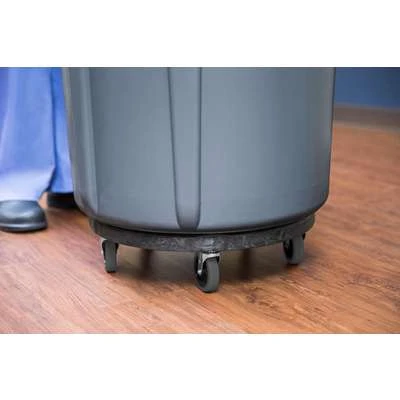 Brute Series container dollies by Rubbermaid are wheeled platforms that hold Brute Series trash cans, making it easier to transport cans. The can is secured to the base to reduce the risk of tipping while the unit is moved.