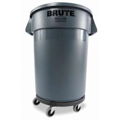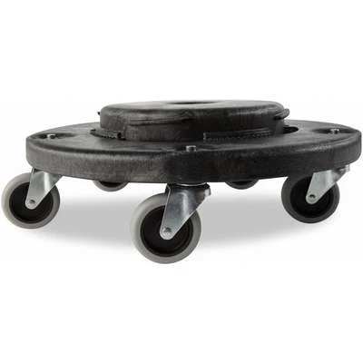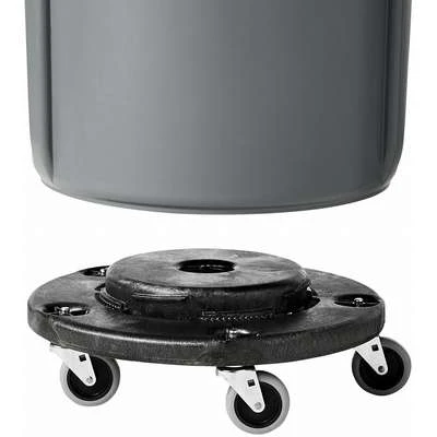 Brute Series container dollies by Rubbermaid are wheeled platforms that hold Brute Series trash cans, making it easier to transport cans. The can is secured to the base to reduce the risk of tipping while the unit is moved.