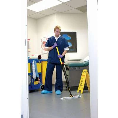 The Rubbermaid Commercial Pulseâ„¢ on-board cleaning system allows you to clean more square feet in less time. This mop kit features a red ergonomic trigger handle that dispenses 3 streams of cleaning solution behind the microfiber mop pad with each press. With lightweight construction, this floor mop only weighs 4 lb. when fully loaded with solution. Its high-capacity refillable reservoir holds 21-oz.of solution to clean up to 850 sq. ft. of floor space. Includes 18″ Quick-Connect frame, but also works with 11″ and 24″ Quick-Connect frames and pads.