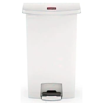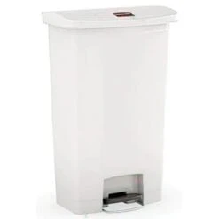 - Slim Jim step-on trash can from Rubbermaid Commercial. Able to sit upright against walls, it’s perfect for your restaurant, school, hotel, corridor, or other area with limited space. Featuring a slim design and a small footprint, this unit is ideal for hallways, crowded walkways and other public areas behind your bar or beside desks in office spaces. Plus, the trash can’s built-in retainer band ensures that trash bag liners are held securely in place.