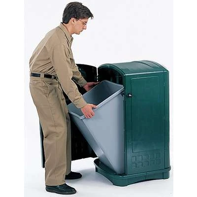 Plaza Series outdoor trash cans from Rubbermaid have a fully covered top and spring-loaded doors that hide waste, reduce odors, and prevent pests and rodents from entering the can. The slide-out bag holder supports the bag and keeps it open and allows workers to change bags without bending. A compatible rigid liner can be used in place of the bag holder to make the container FM approved.